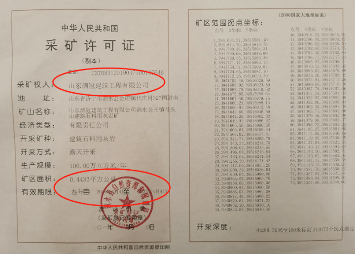 已关停的矿山不仅“复活”✿◈✿,而且矿区面积有了大幅扩展✿◈✿。记者在泗水县自然资源和规划局批复的采矿许可证上看到✿◈✿,批复给泗冠建筑工程公司的矿区面积✿◈✿,从原来的0.0386平方公里✿◈✿,扩大到了0.4433平方公里✿◈✿,增长超过10倍✿◈✿。